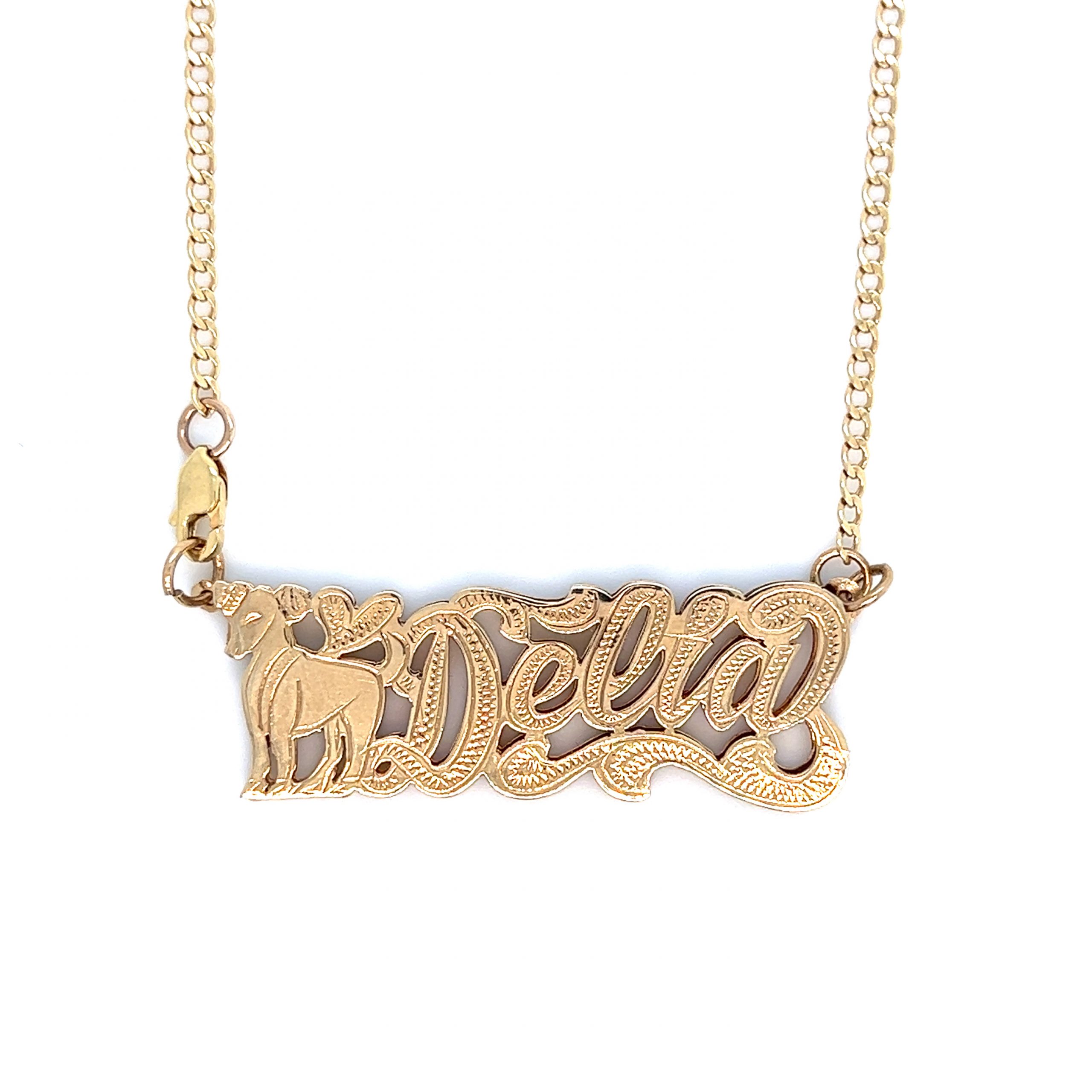Own a one of a kind custom hand made nameplate necklace. This design can be made in your name or any name of your choice. Its completely hand made from scratch. The attention to detail really comes out as compared to a machine made one that looks bland and no design. This particular designs come in yellow gold? with hand carved Panama design with diamond cuts throughout the piece to give it a beautiful luster and shine while making the nameplate really stand out. An added touch of personalization this nameplate features your Horoscope sign in front of your name. You can also add CZ stones or Real Diamonds to the nameplate. with your choice of amount of diamonds. You can buy a chain or attach your own. Available in 10k and 14k pure gold.? Please allow 7-10 business days for your handmade order to ship.