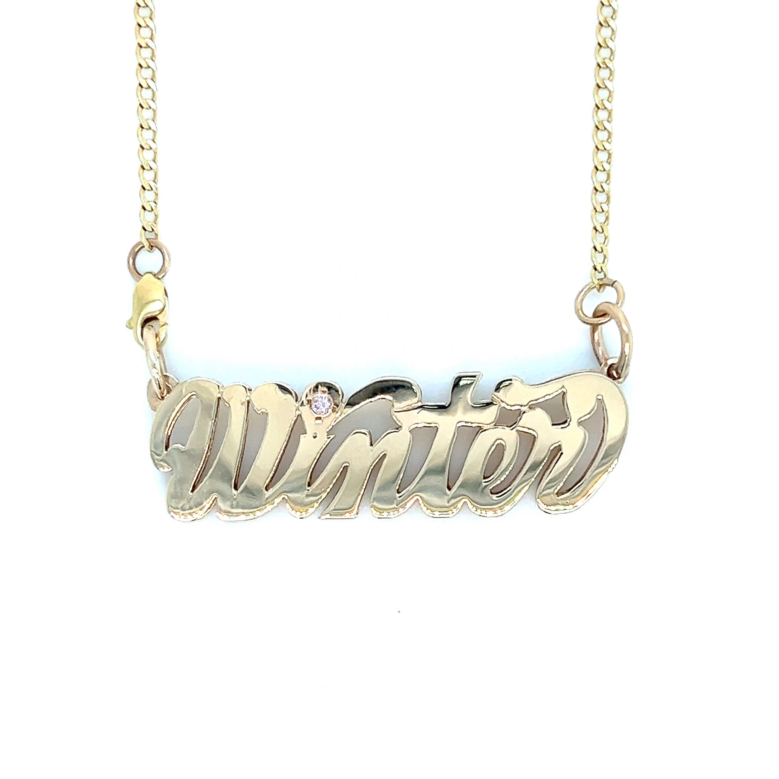 Own a one of a kind custom hand made nameplate necklace. This design can be made in your name or any name of your choice. Its completely hand made from scratch. The attention to detail really comes out as compared to a machine made one that looks bland and no design. This particular designs come in yellow with a high mirror polish throughout the piece to give it a beautiful luster and shine and features a diamond cut border design. This a more simple single plate design. buy a chain or attach your own. Available in 10k and 14k pure gold.? Please allow 7-10 business days for your handmade order to ship.