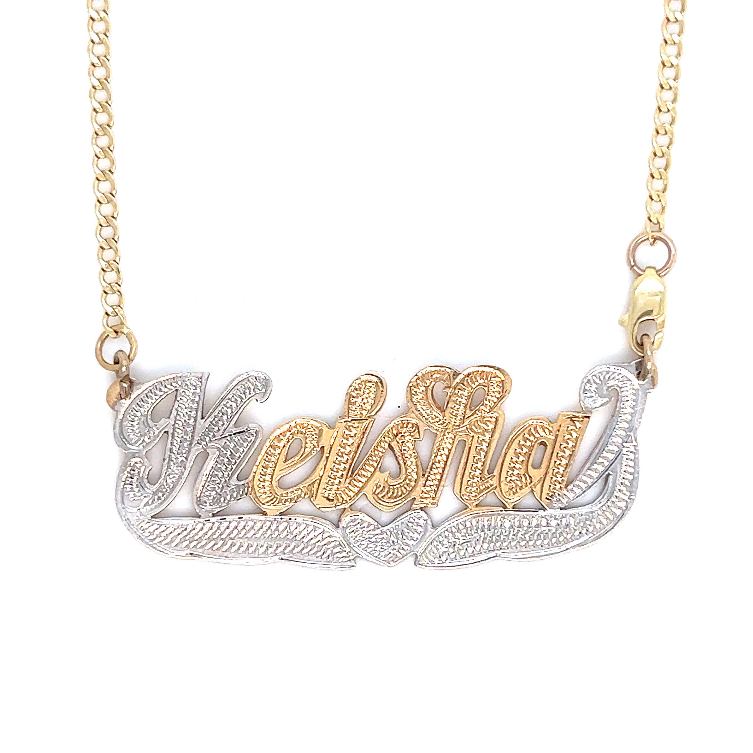 Own a one of a kind custom hand made nameplate necklace. This design can be made in your name or any name of your choice. Its completely hand made from scratch. The attention to detail really comes out as compared to a machine made one that looks bland and no design. This particular designs come in yellow and white gold with hand carved diamond cuts throughout the piece to give it a beautiful luster and shine while making the nameplate really stand out. An added touch of a extra diamond cuts. This a more simple single plate design. buy a chain or attach your own. Available in 10k and 14k pure gold.? Please allow 7-10 business days for your handmade order to ship.