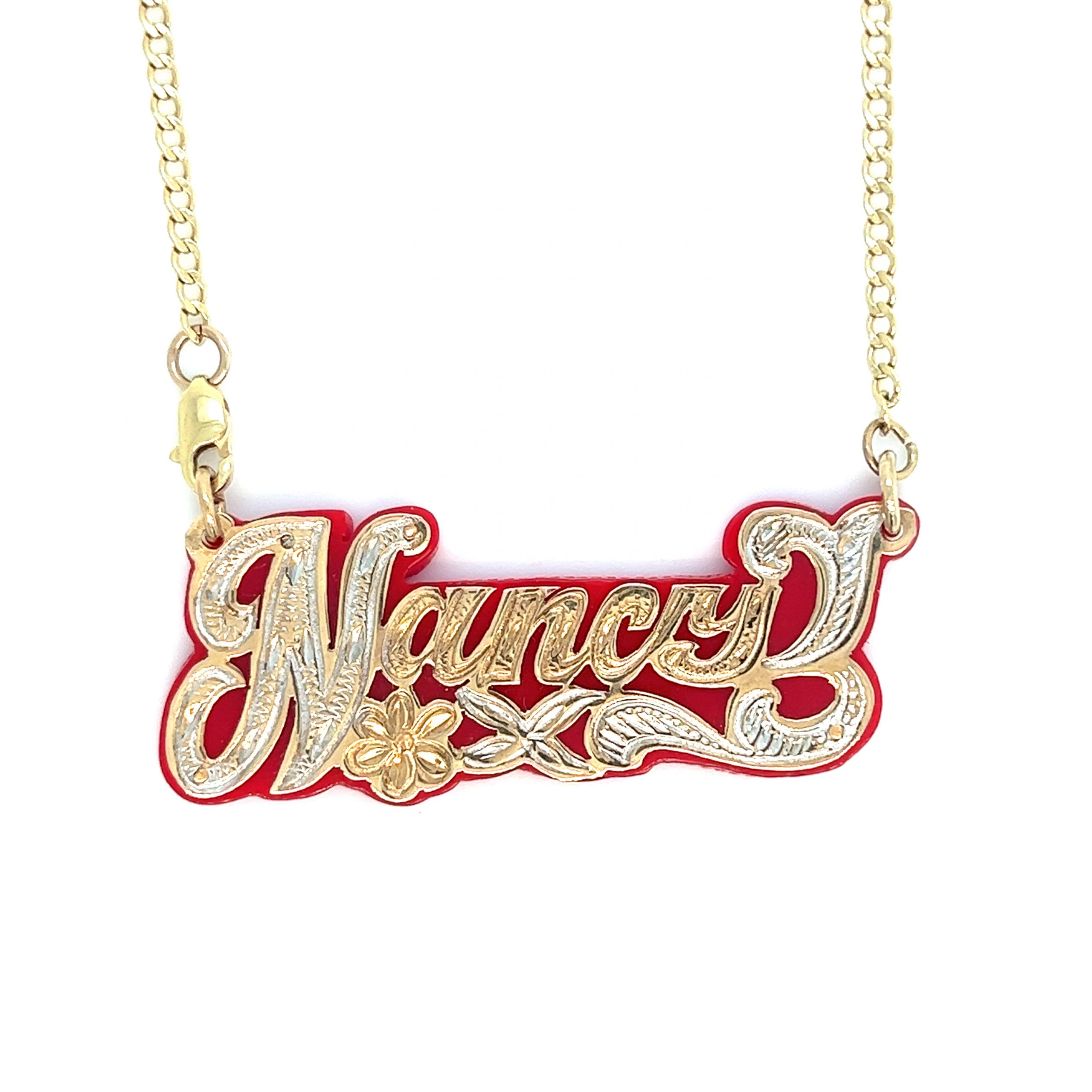 Own a one of a kind custom hand made nameplate necklace. This design can be made in your name or any name of your choice. Its completely hand made from scratch. The attention to detail really comes out as compared to a machine made one that looks bland and no design. This particular designs come in yellow and white gold with hand carved diamond cuts throughout the piece to give it a beautiful luster and shine while making the nameplate really stand out. An added touch of a colored stone background, with your choice of color. This a more simple single plate design. buy a chain or attach your own. Available in 10k and 14k pure gold.? Please allow 7-10 business days for your handmade order to ship.