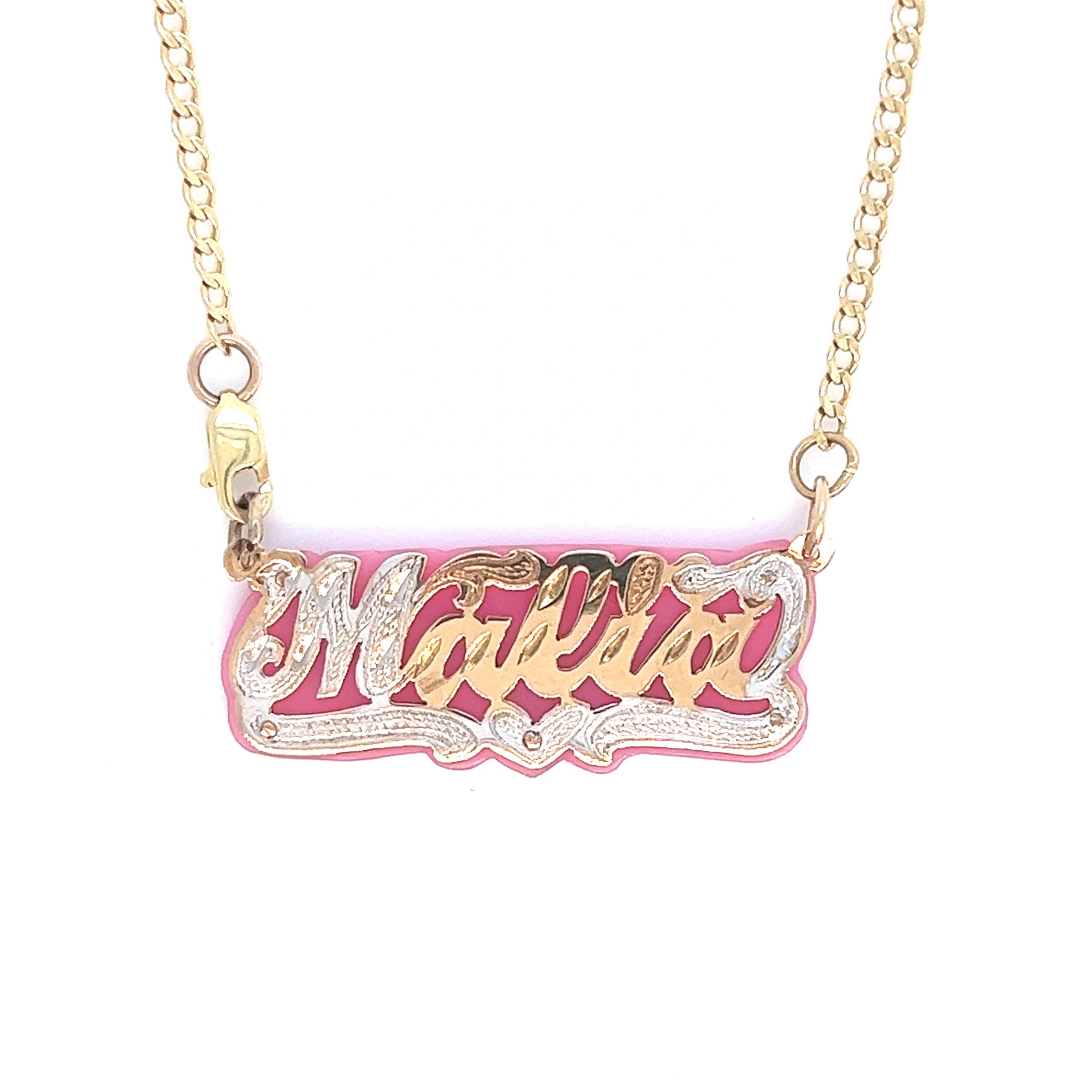 Own a one of a kind custom hand made nameplate necklace. This design can be made in your name or any name of your choice. Its completely hand made from scratch. The attention to detail really comes out as compared to a machine made one that looks bland and no design. This particular designs come in yellow with a high mirror polish throughout the piece to give it a beautiful luster and shine and features a diamond cut border design. This a more simple single plate design. buy a chain or attach your own. Available in 10k and 14k pure gold.? Please allow 7-10 business days for your handmade order to ship.